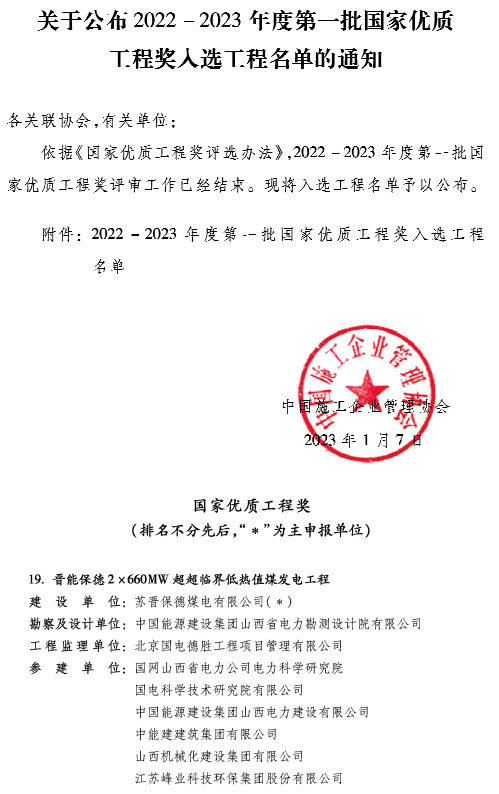2023年1月7日,中国施工企业管理协会下发了《关于公布2022—2023年度第一批国家优质工程奖入选工程名单的通知》中施企协字【2023】1号。“晋能保德2×660MW超超临界低热值煤发电工程”荣列入选名单,标志着该工程喜获大奖。
