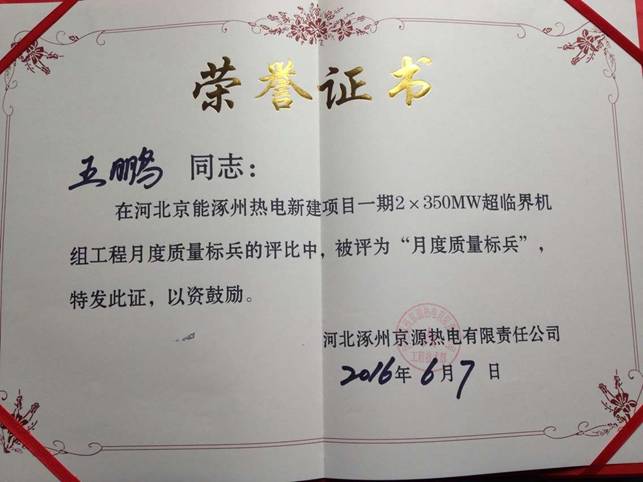 涿州项目部王鹏、王云、黄光富三名同志获得业主“月度质量标兵”荣誉表彰!