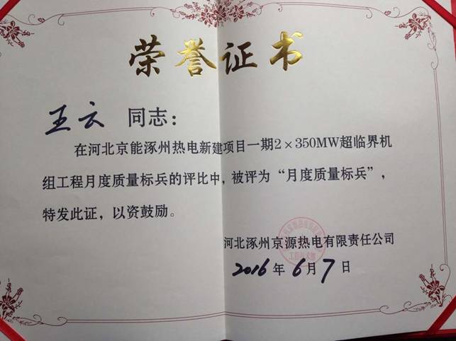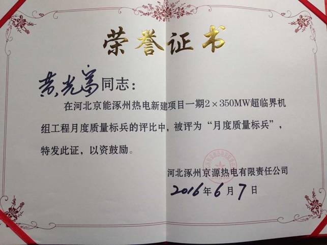 涿州项目部三名同志获得业主“月度质量标兵”荣誉表彰